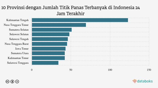 Sebanyak 48 titik panas terdeteksi di Sulawesi Selatan, Sulawesi Tengah menyusul dengan 46 titik panas, serta Nusa Tenggara Barat dan Jawa Timur masing-masing memiliki 45 dan 43 titik panas terdeteksi.
