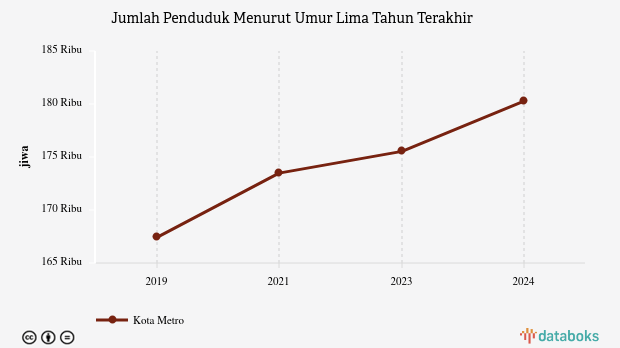 Jumlah penduduk di Kota Metro tercatat 180,28 ribu jiwa data per 2024. Angka ini bertambah dibanding 2023 dan lebih tinggi dibanding Desember 2021. Dibandingkan dengan lima tahun sebelumnya, rata-rata pertumbuhan tahunan (CAGR) wilayah ini tercatat lebih tinggi. Adapun pertumbuhan lima tahun terakhir, tercatat diangka 1,76%.