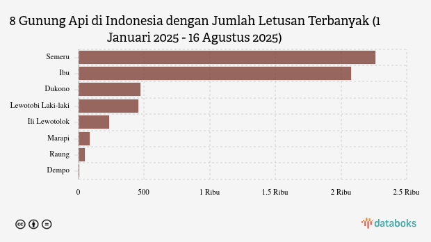 Selama tahun 2025, MAGMA Indonesia telah merekam 5.637 letusan/erupsi gunung api di seluruh Indonesia. Gunung Semeru di Jawa Timur paling banyak erupsi (2.261 kali letusan) sedangkan Gunung Ili Lewotolok erupsi 235 kali.