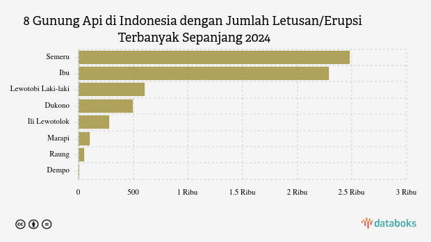 Selama tahun 2025, MAGMA Indonesia telah merekam 6.306 letusan/erupsi gunung api di seluruh Indonesia. Gunung Semeru di Jawa Timur paling banyak erupsi (2.481 kali letusan) sedangkan Gunung Ibu erupsi 2.288 kali.