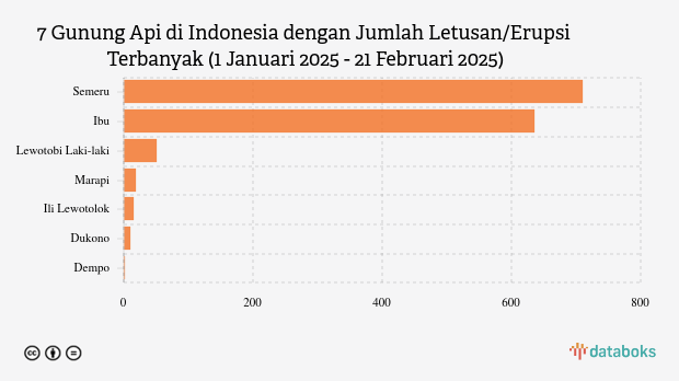 Selama tahun 2025, MAGMA Indonesia telah merekam 1.443 letusan/erupsi gunung api di seluruh Indonesia. Gunung Semeru di Jawa Timur paling banyak erupsi dengan 711 kali letusan.