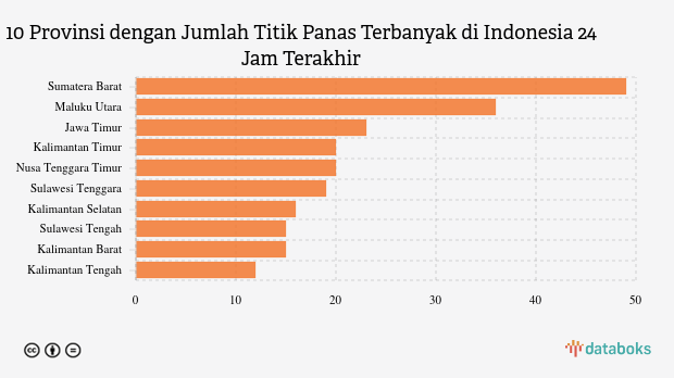 Titik panas terdeteksi paling banyak berada di Sumatera Barat sebanyak 49 titik. Maluku Utara menempati posisi kedua jumlah titik panas terbanyak dengan 36 titik. Jawa Timur berada di posisi ketiga sebanyak 23 titik panas.