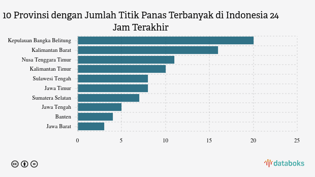 Titik panas terdeteksi paling banyak berada di Kepulauan Bangka Belitung sebanyak 20 titik. Kalimantan Barat menempati posisi kedua jumlah titik panas terbanyak dengan 16 titik. Nusa Tenggara Timur berada di posisi ketiga sebanyak 11 titik panas.