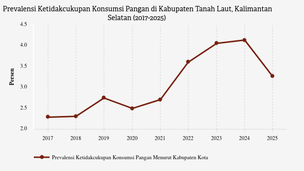 Berdasarkan data Badan Pusat Statistik (BPS), prevalensi ketidakcukupan pangan (Prevalence of Undernourishment/PoU) di Kabupaten Tanah Laut, Kalimantan Selatan sebesar 3,27% pada 2025.