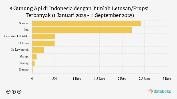 Selama tahun 2025, MAGMA Indonesia telah merekam 6.043 letusan/erupsi gunung api di seluruh Indonesia. Gunung Semeru di Jawa Timur paling banyak erupsi (2.422 kali letusan) sedangkan Gunung Marapi erupsi 96 kali.