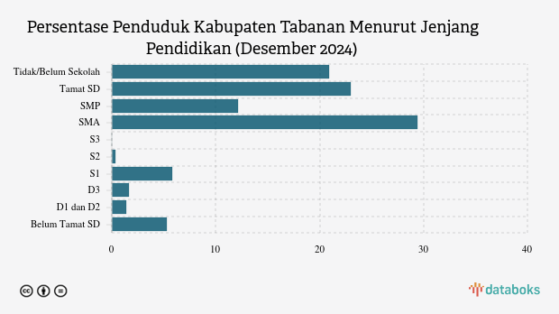 Berikut ini rincian jumlah penduduk Kabupaten Tabanan, Bali menurut jenjang pendidikan per Desember 2024.