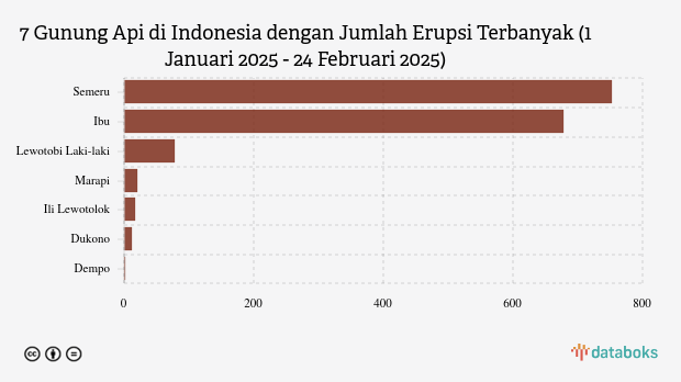 Selama tahun 2025, MAGMA Indonesia telah merekam 1.560 letusan/erupsi gunung api di seluruh Indonesia. Gunung Semeru di Jawa Timur paling banyak erupsi (753 kali letusan) sedangkan Gunung Ibu erupsi 678 kali.