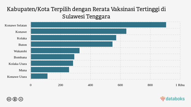 Rerata vaksinasi tiga kabupaten/kota teratas dengan angka di atas 1.000 dosis adalah Konawe Selatan, Konawe dan Kolaka dengan masing-masing nilai 905 dosis, 639 dosis dan 571 dosis.