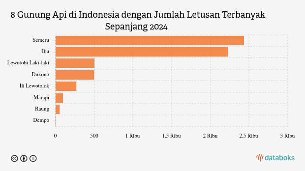 Selama tahun 2025, MAGMA Indonesia telah merekam 6.066 letusan/erupsi gunung api di seluruh Indonesia. Gunung Semeru di Jawa Timur paling banyak erupsi (2.433 kali letusan) sedangkan Gunung Ibu erupsi 2.226 kali.