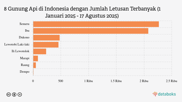 Selama tahun 2025, MAGMA Indonesia telah merekam 5.644 letusan/erupsi gunung api di seluruh Indonesia. Gunung Semeru di Jawa Timur paling banyak erupsi dengan 2.265 kali letusan.