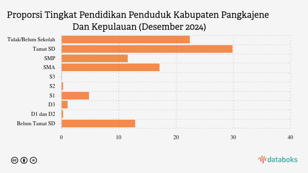 Sementara itu, ada 12,86% penduduk Kabupaten Pangkajene Dan Kepulauan yang belum tamat SD. Adapun penduduk yang tidak/belum sekolah sejumlah 22,35%.