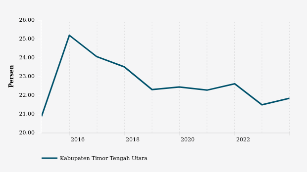 Perkembangan persentase penduduk miskin dalam 10 tahun di Kabupaten Timor Tengah Utara dalam tren turun dari yang semula kemiskinan sebesar 20,89 persen, kemudian sempat berada di titik tertinggi sebesar 25,2 persen dan setelahnya pada tahun kemarin menuju ke 21,85 persen.