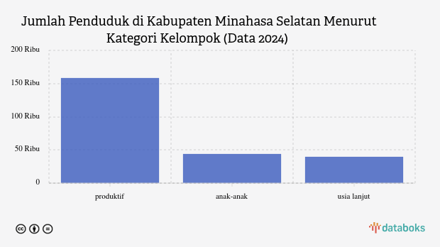 Data Badan Pusat Statistik (BPS) 2024, 158,81 ribu atau sekitar 65,5% penduduk di Kabupaten Minahasa Selatan adalah kelompok produktif yang berusia 15-59 tahun. Adapun 18,14% dari total penduduk atau sekitar 43.988 adalah anak-anak (usia 0-14 tahun) dan 16,36% lainnya adalah penduduk dengan usia lebih dari 60 tahun.