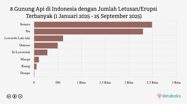 Selama tahun 2025, MAGMA Indonesia telah merekam 6.320 letusan/erupsi gunung api di seluruh Indonesia. Gunung Semeru di Jawa Timur paling banyak erupsi (2.485 kali letusan) sedangkan Gunung Ili Lewotolok erupsi 281 kali.