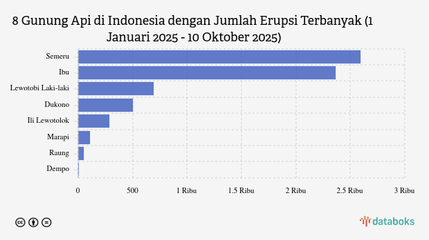 Selama tahun 2025, MAGMA Indonesia telah merekam 6.603 letusan/erupsi gunung api di seluruh Indonesia. Gunung Semeru di Jawa Timur paling banyak erupsi dengan 2.593 kali letusan.