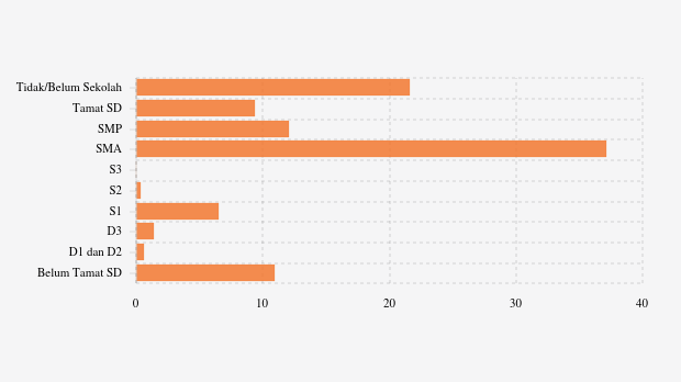 Selanjutnya, proporsi penduduk dengan tamatan SMA sebesar 37,16%. Lulusan SMP dan SD masing-masing 12,04% dan 9,34%.