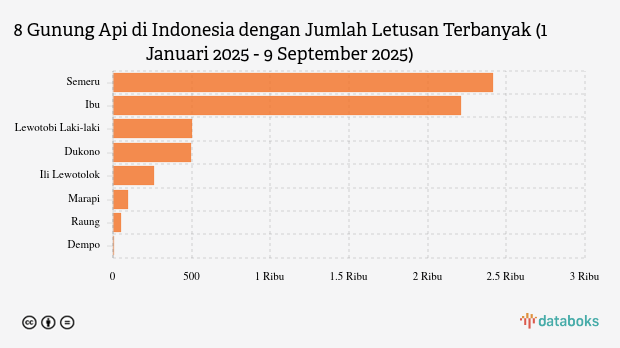 Selama tahun 2025, MAGMA Indonesia telah merekam 6.029 letusan/erupsi gunung api di seluruh Indonesia. Gunung Semeru di Jawa Timur paling banyak erupsi (2.417 kali letusan) sedangkan Gunung Ibu erupsi 2.211 kali.