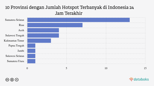 Titik panas terdeteksi paling banyak berada di Sumatera Selatan sebanyak 13 titik. Riau menempati posisi kedua jumlah titik panas terbanyak dengan 7 titik. Aceh berada di posisi ketiga sebanyak 4 titik panas.