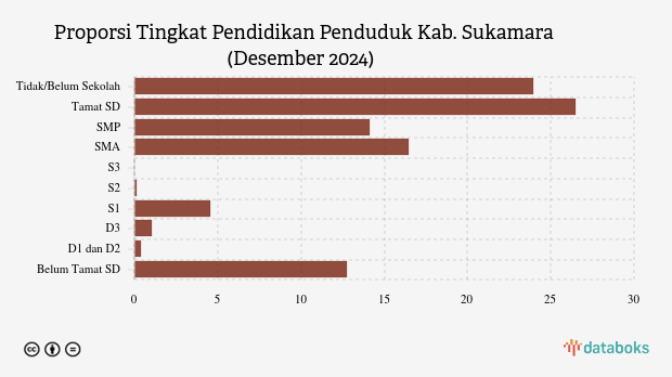 Sementara itu, ada 12,75% penduduk Kabupaten Sukamara yang belum tamat SD. Adapun penduduk yang tidak/belum sekolah sejumlah 23,98%.