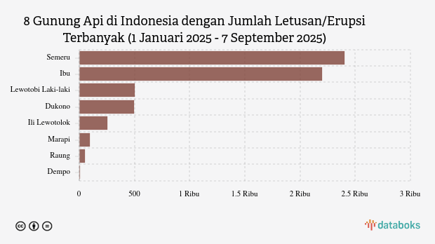 Selama tahun 2025, MAGMA Indonesia telah merekam 6.000 letusan/erupsi gunung api di seluruh Indonesia. Gunung Semeru di Jawa Timur paling banyak erupsi (2.402 kali letusan) sedangkan Gunung Ibu erupsi 2.202 kali.