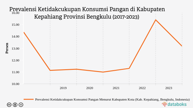 Badan Pusat Statistik (BPS) melaporkan, prevalensi ketidakcukupan pangan (Prevalence of Undernourishment/PoU) di Kabupaten Kepahiang, Bengkulu sebesar 13,17% pada 2023.