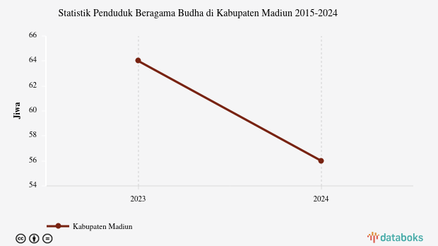 Penduduk beragama Budha di Kabupaten Madiun, data per 31 Desember 2024 tercatat 56 jiwa. Dibandingkan dengan tahun sebelumnya, jumlah penduduk memeluk agama Budha di kabupaten/kota turun 8 jiwa