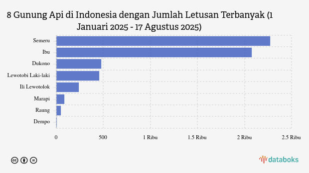 Selama tahun 2025, MAGMA Indonesia telah merekam 5.654 letusan/erupsi gunung api di seluruh Indonesia. Gunung Semeru di Jawa Timur paling banyak erupsi dengan 2.271 kali letusan.