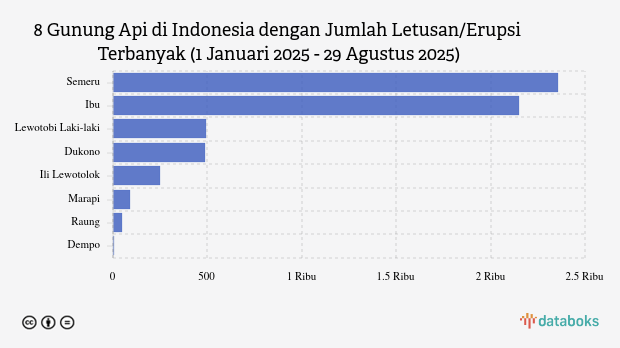 Selama tahun 2025, MAGMA Indonesia telah merekam 5.881 letusan/erupsi gunung api di seluruh Indonesia. Gunung Semeru di Jawa Timur paling banyak erupsi (2.355 kali letusan) sedangkan Gunung Ibu erupsi 2.149 kali.