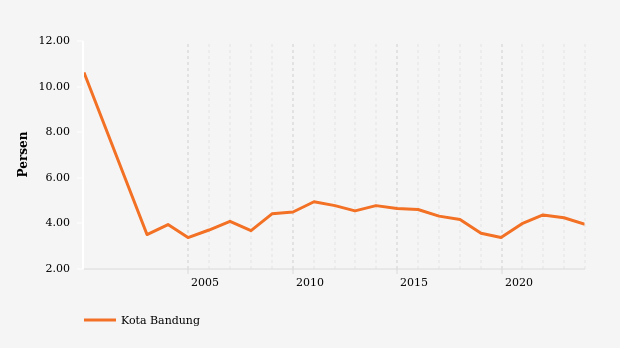 Perkembangan persentase penduduk miskin dalam 10 tahun di kota Bandung dalam tren turun, bergerak dari kemiskinan sebesar 10,62 persen menuju ke 3,96 persen. Menurut data Badan Pusat Statistik (BPS), total penduduk yang dicatatkan pada 2023 lalu di kota ini berjumlah 2,56 juta jiwa.