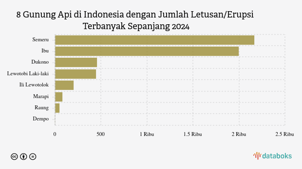 Selama tahun 2025, MAGMA Indonesia telah merekam 5.391 letusan/erupsi gunung api di seluruh Indonesia. Gunung Semeru di Jawa Timur paling banyak erupsi (2.164 kali letusan) sedangkan Gunung Ibu erupsi 1.995 kali.