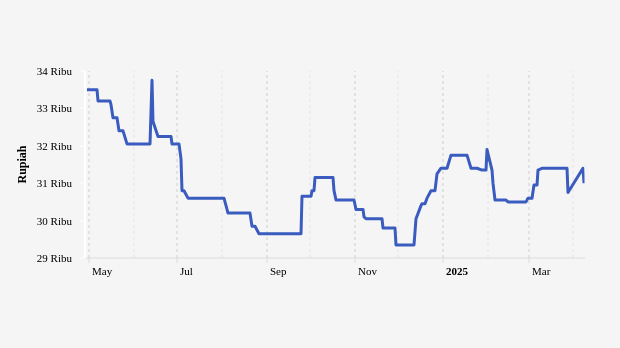 Sedangkan harga telur ayam ras segar harian di pasar tradisional dalam tiga bulan terakhir di Sulawesi Tengah telah mengalami kenaikan sebesar 4,03% dari sebelumnya yang tercatat di harga Rp29,8 ribu.