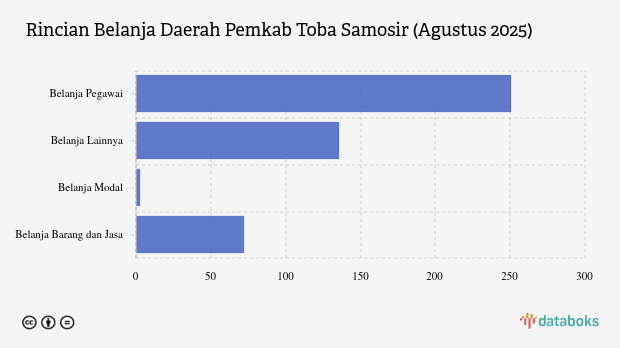 Berdasarkan data Anggaran Pendapatan dan Belanja Daerah (APBD) 2025, anggaran Belanja Daerah Pemerintah Kabupaten (Pemkab) Toba Samosir, Provinsi Sumatera Utara, mencapai Rp1.329,74 miliar.