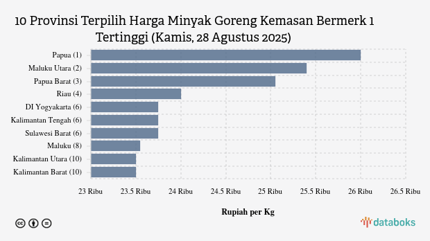 Kemudian di urutan ketiga, harga minyak goreng kemasan bermerk 1 di Papua Barat seharga Rp.25.050 per kg, Riau Rp.24.000 per kg, dan Kalimantan Tengah Rp.23.750 per kg.
