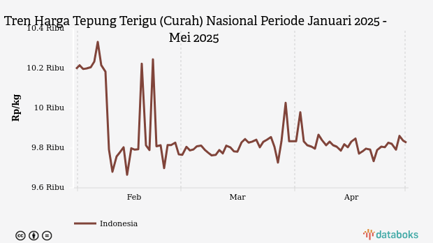Selama periode Januari 2025 - Mei 2025, rata-rata harga tepung terigu curah terendah Rp9.722 per kg pada Jumat, 31 Januari 2025. Adapun harga tertinggi mencapai Rp9.980 per kg pada Rabu, 2 April 2025.