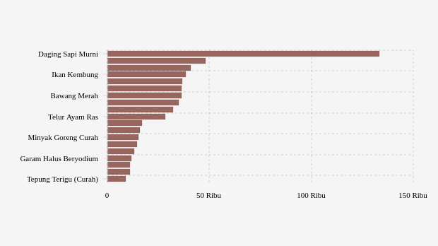 Komoditas ikan bandeng naik paling tinggi Rp2.900 (7,63%) menjadi Rp40.900 per kg. Adapun harga bawang merah turun paling tajam Rp2.100 (5,48%) menjadi Rp36.250 per kg.
