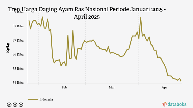 Selama periode Januari 2025 - April 2025, rata-rata harga daging ayam terendah Rp34.126 per kg pada Sabtu, 26 April 2025. Adapun harga tertinggi mencapai Rp38.537 per kg pada Rabu, 2 April 2025.