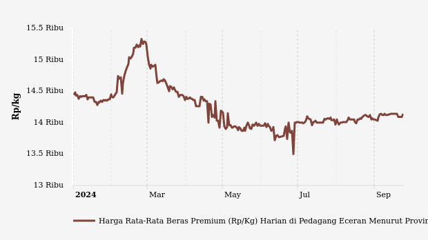 Sepanjang 2024, rata-rata harga beras premium terendah Rp13.720 per kg pada Rabu, 12 Juni 2024. Adapun harga tertinggi mencapai Rp15.330 per kg pada Minggu, 25 Februari 2024.