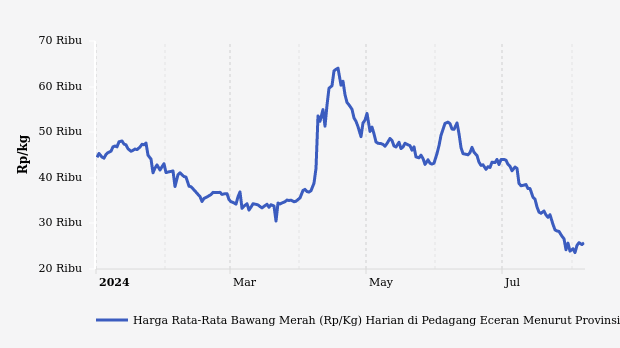 Sepanjang 2024, rata-rata harga bawang merah terendah Rp23.600 per kg pada Jumat, 2 Agustus 2024. Adapun harga tertinggi mencapai Rp64.040 per kg pada Kamis, 18 April 2024.