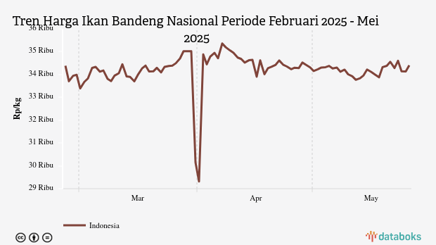 Selama periode Februari 2025 - Mei 2025, rata-rata harga ikan bandeng terendah Rp33.392 per kg pada Sabtu, 1 Maret 2025. Adapun harga tertinggi mencapai Rp35.360 per kg pada Senin, 7 April 2025.