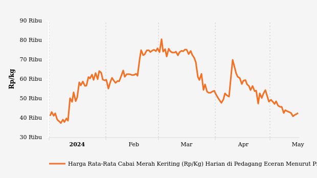 Sepanjang 2024, rata-rata harga cabai merah terendah Rp37.490 per kg pada Minggu, 7 Januari 2024. Adapun harga tertinggi mencapai Rp80.620 per kg pada Sabtu, 2 Maret 2024.