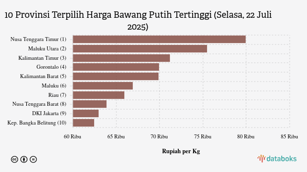Harga bawang putih harian di pasar modern Nusa Tenggara Timur menjadi yang termahal se-Indonesia dengan harga jual Rp.79.900 per kg. Dibandingkan sebulan lalu, harga bawang putih di provinsi ini tidak mengalami perubahan. Harga jual tertinggi yang pernah dicatat di wilayah ini adalah Rp.79.900 per kg.