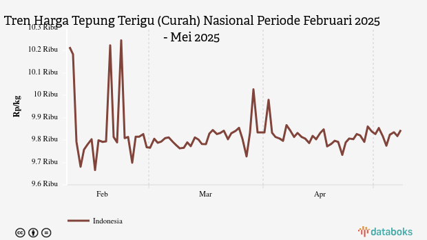 Selama periode Februari 2025 - Mei 2025, rata-rata harga tepung terigu curah terendah Rp9.759 per kg pada Selasa, 11 Februari 2025. Adapun harga tertinggi mencapai Rp9.980 per kg pada Rabu, 2 April 2025.