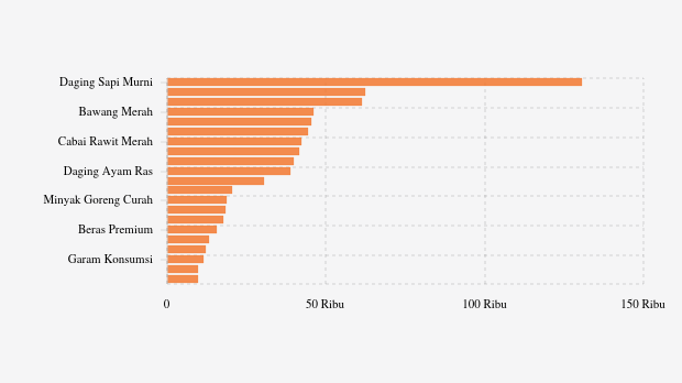 Komoditas bawang putih bonggol naik paling tinggi Rp1.876 (4,92%) menjadi Rp40.001 per kg. Adapun harga cabai rawit merah turun paling dalam Rp1.681 (3,84%) menjadi Rp42.143 per kg.