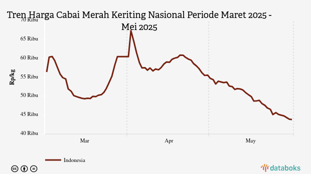 Selama periode Maret 2025 - Mei 2025, rata-rata harga cabai merah terendah Rp43.841 per kg pada Sabtu, 31 Mei 2025. Adapun harga tertinggi mencapai Rp67.297 per kg pada Rabu, 2 April 2025.