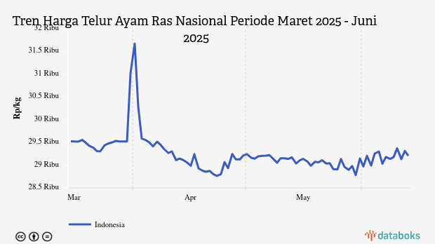 Selama periode Maret 2025 - Juni 2025, rata-rata harga telur ayam terendah Rp28.764 per kg pada Rabu, 23 April 2025. Adapun harga tertinggi mencapai Rp30.242 per kg pada Rabu, 2 April 2025.