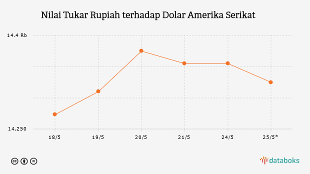 Rupiah dibuka menguat ke level Rp 14.325/US$ pada perdagangan Selasa, 25 Mei 2021 dibandingkan hari sebelumnya yang sebesar Rp 14.355/US$.