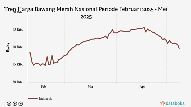 Selama periode Februari 2025 - Mei 2025, rata-rata harga bawang merah terendah Rp34.872 per kg pada Senin, 17 Februari 2025. Adapun harga tertinggi mencapai Rp45.742 per kg pada Kamis, 17 April 2025.