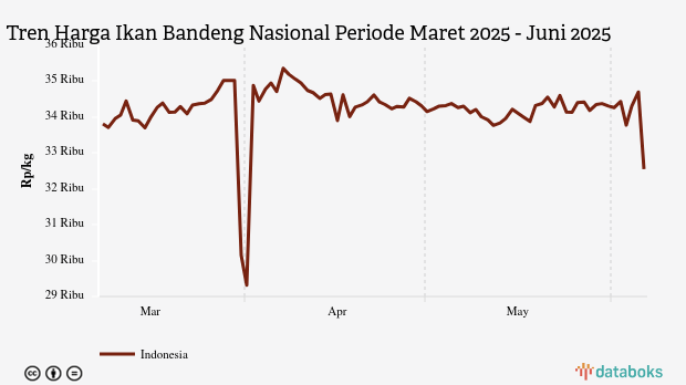 Selama periode Maret 2025 - Juni 2025, rata-rata harga ikan bandeng terendah Rp32.548 per kg pada Jumat, 6 Juni 2025. Adapun harga tertinggi mencapai Rp35.360 per kg pada Senin, 7 April 2025.
