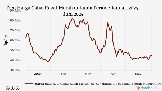 Sementara dilihat dari tren harga 3 bulan terakhir, rata-rata harga cabai rawit di wilayah Jambi turun Rp31.200 (41,45%).