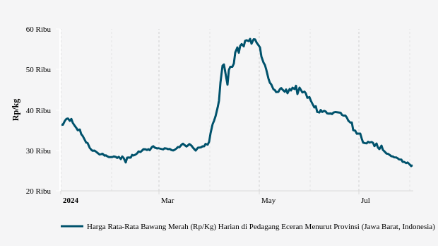 Berdasarkan data harga pangan eceran Badan Pangan Nasional (Bapanas) pada Jumat (2/8/2024) pukul 17.24 WIB, harga bawang merah di Jawa Barat mencapai Rp26.380 per kg.